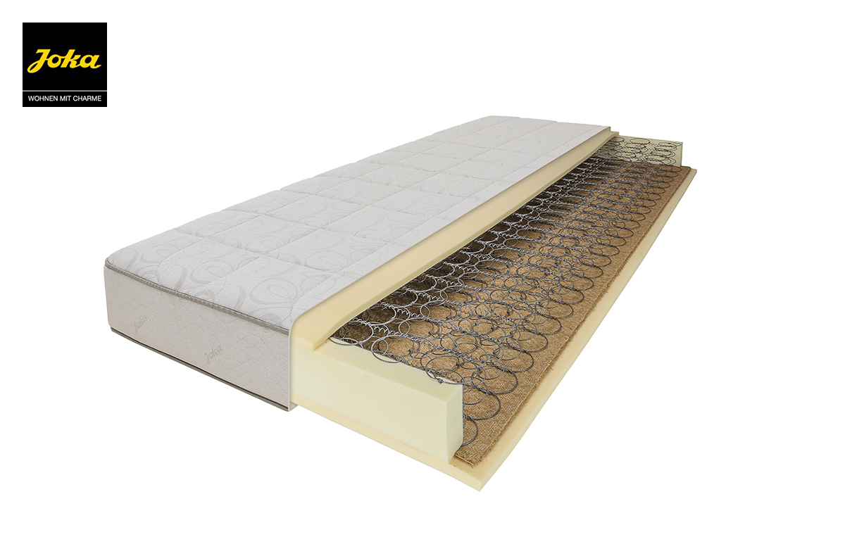 Höhe ca. 19 oder 23cm für individuellen Liegekomfort. Innen doppelt vergüteter JOKA-Federkern 5-Gang mit Randsteg und beidseitiger Komfortschaumauflage.