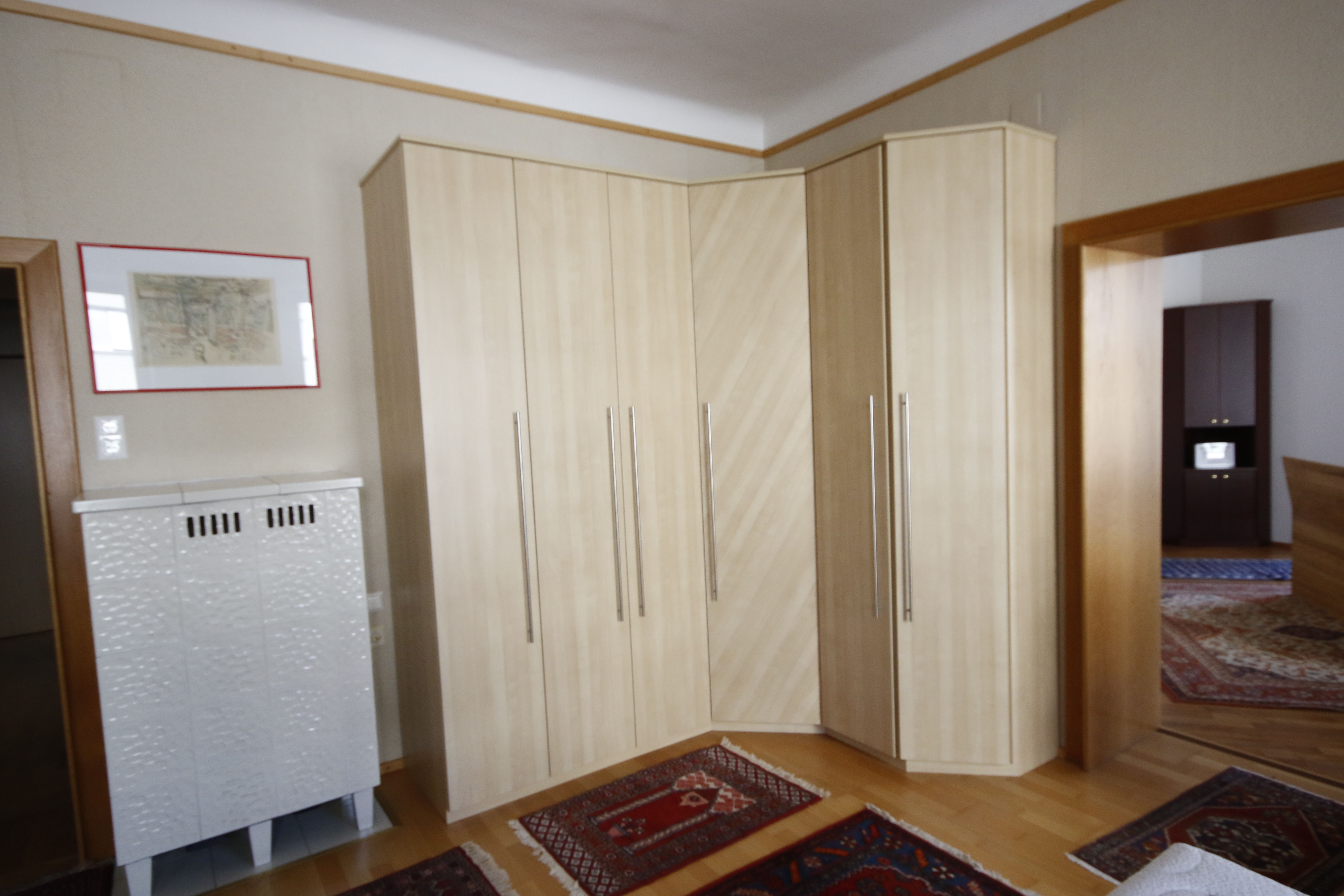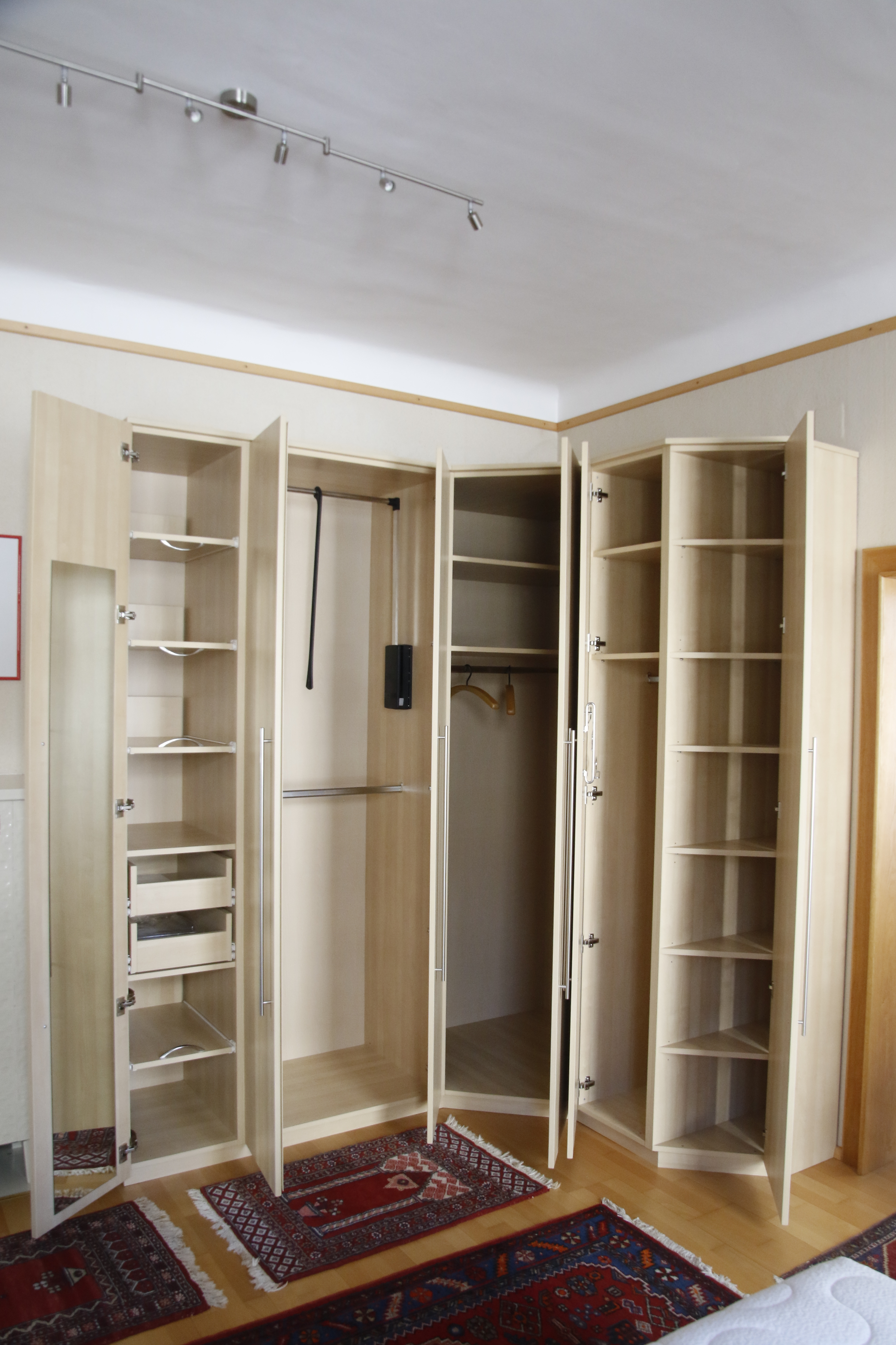 Komfortabler extravaganter Eckkleiderschrank. Mit dem für hängen und legen unterteiltem Eckteil, dem Türenteil mit Innenspiegel samt Weitwinkelscharnieren sowie Innenladen und Innenauszügen, dem Doppeltürenteil für 2x hängen mit Lift und dem Endschrägtürteil.