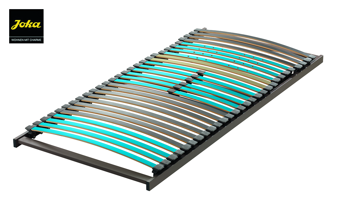 Ausführung starr mit 28 beweglich gelagerten Federholzleisten in holmüberdeckenden Doppelkappen für flexiblen Liegekomfort auch im Randbereich im Schichtholzrahmen eingearbeitet.