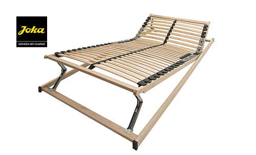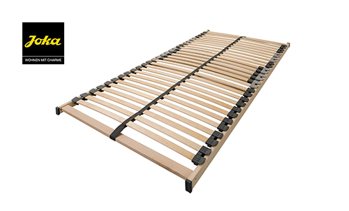 Ausführung mit 28 mehrfach verleimte, verzugsfreie Federholzleisten in beweglichen Doppelkappen flexibel im Schichtholzrahmen gelagert mit Mittelzonenverstärkung.